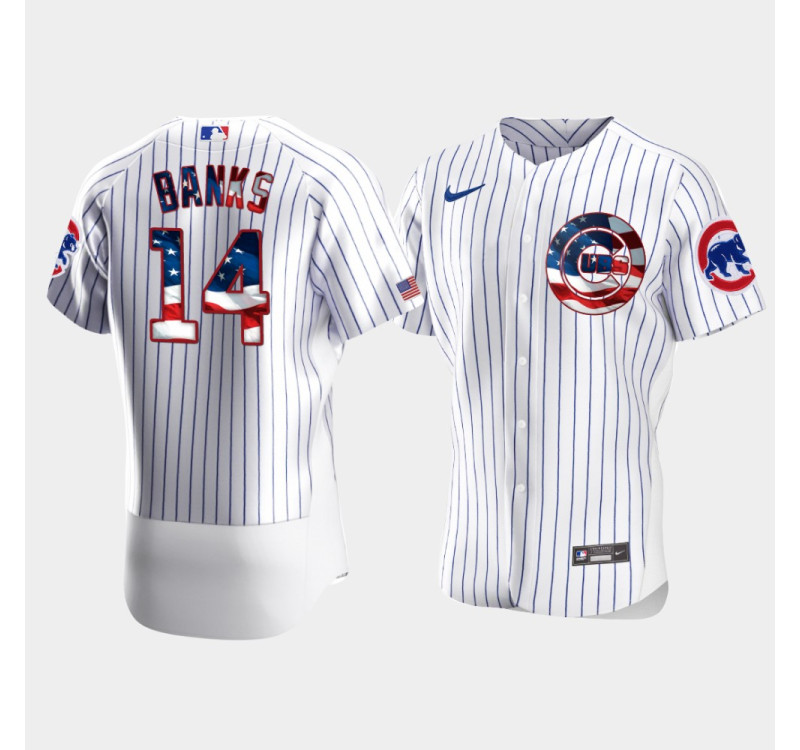 Men's Chicago Cubs #14 Ernie Banks White 4th of July 2020 Stars & Stripes Jersey
